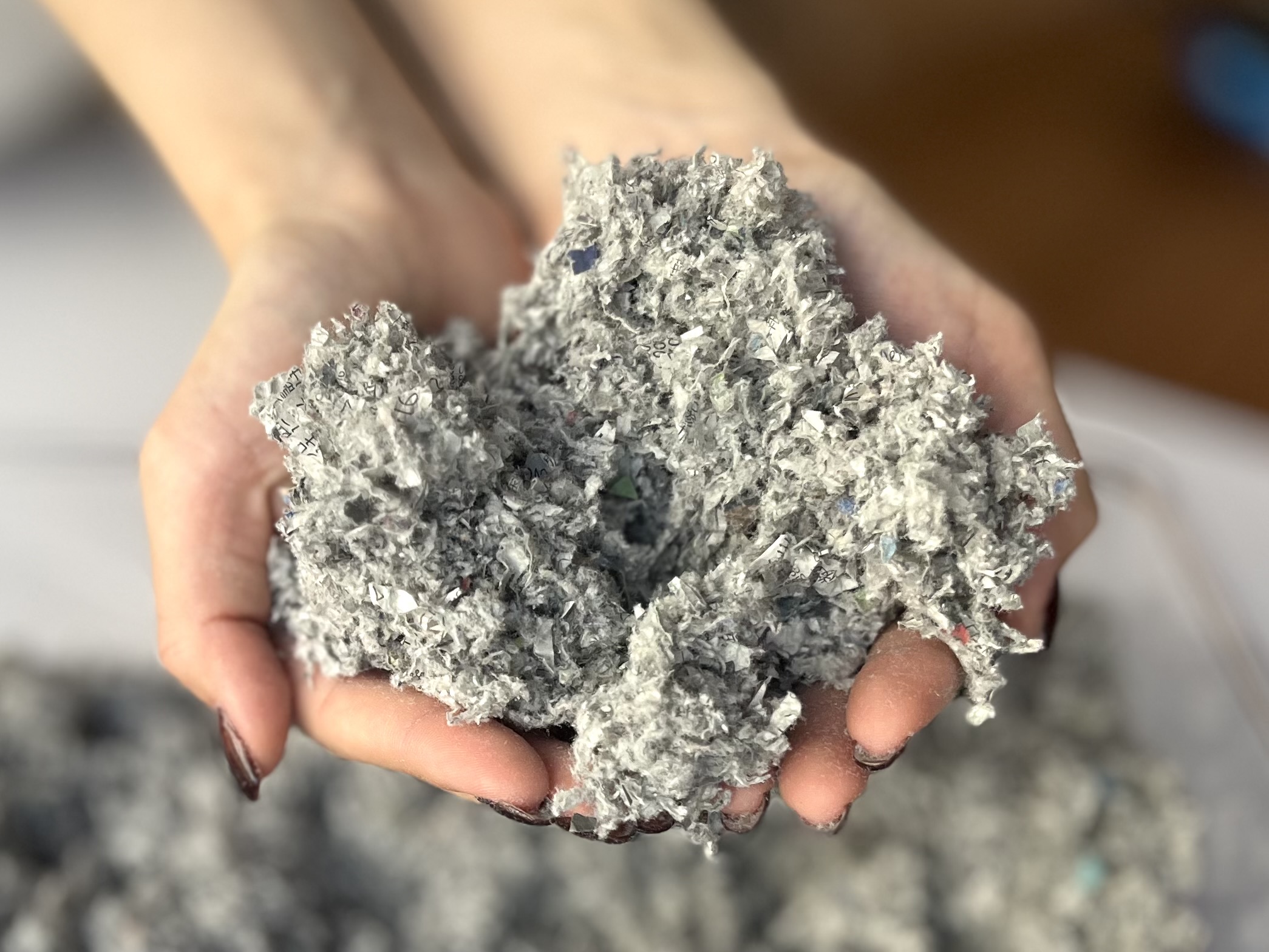 細断した新聞紙とホウ酸・ホウ砂から作られるエコロジーな断熱材。
